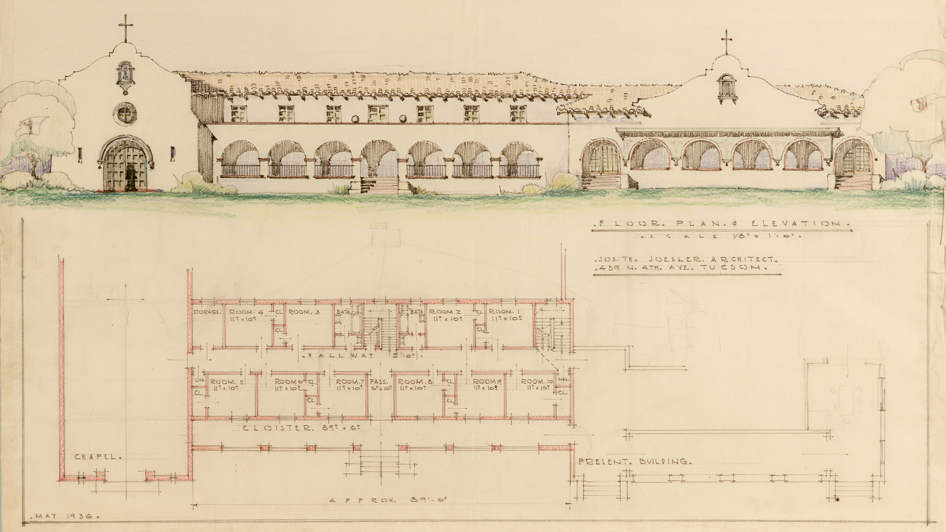 On July 28, 1935 the Benedictine Sisters purchase the Steinfeld Mansion at 300 N. Main Street in Tucson establishing the second branch house of their American Benedictine Order. The Mansion had been designed by architect Henry Trost in 1898 in a affluent neighborhood of the city today known as El Presidio. The first pioneer sisters arrived in Tucson to prepare the convent on August 17, 1935, and sixteen sisters arrived in Tucson to form the new community on October 30 of that year.