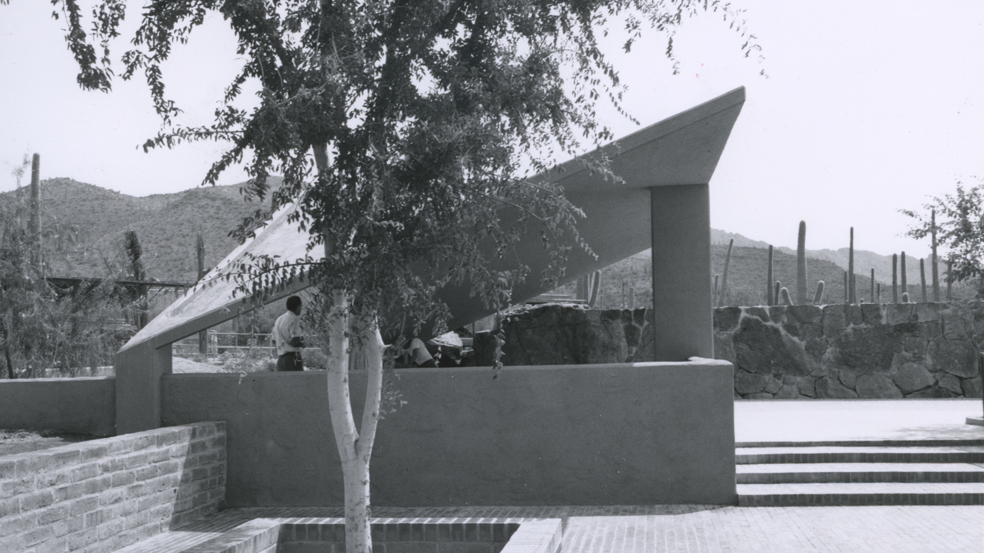 A second section of the garden was completed in 1971.16 Linked by steps and a ramp to the upper areas, the new “Mexican Garden” included a geometric fountain with tile inserts made by Nathan Perlman and a traditional Tohono O’Odham ramada. Local Yaqui Indians created a curved wall of mud adobe to function as a windbreak against the open desert. River rock paving owed from the area around the fountain into a shady retreat surrounded by palms. Large concrete containers were fashioned by Jack Hastings.17